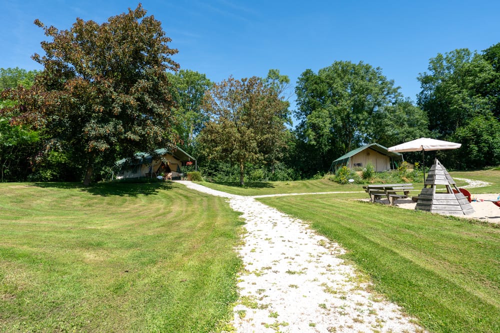 De tenten staan ruim uit elkaar en bieden uitzicht op een groot (speel)veld met een natuurlijke vijver. Elk verblijf heeft een eigen terras, waar je heerlijk kunt ontspannen en genieten van de omgeving. Als het wat kouder is warm je binnen op met de houtpelletkachel.
