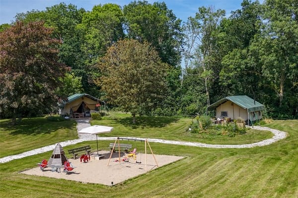 Op ons ruime (speel)veld, omringd door bomen, staan vier comfortabele safaritenten. Ze liggen op voldoende afstand van elkaar, zodat je volop van rust en privacy kunt genieten. Elke tent biedt plaats aan vier personen en beschikt over een eigen terras, badkamer en keuken. Vanuit je verblijf heb je een prachtig uitzicht op de grote vijver.