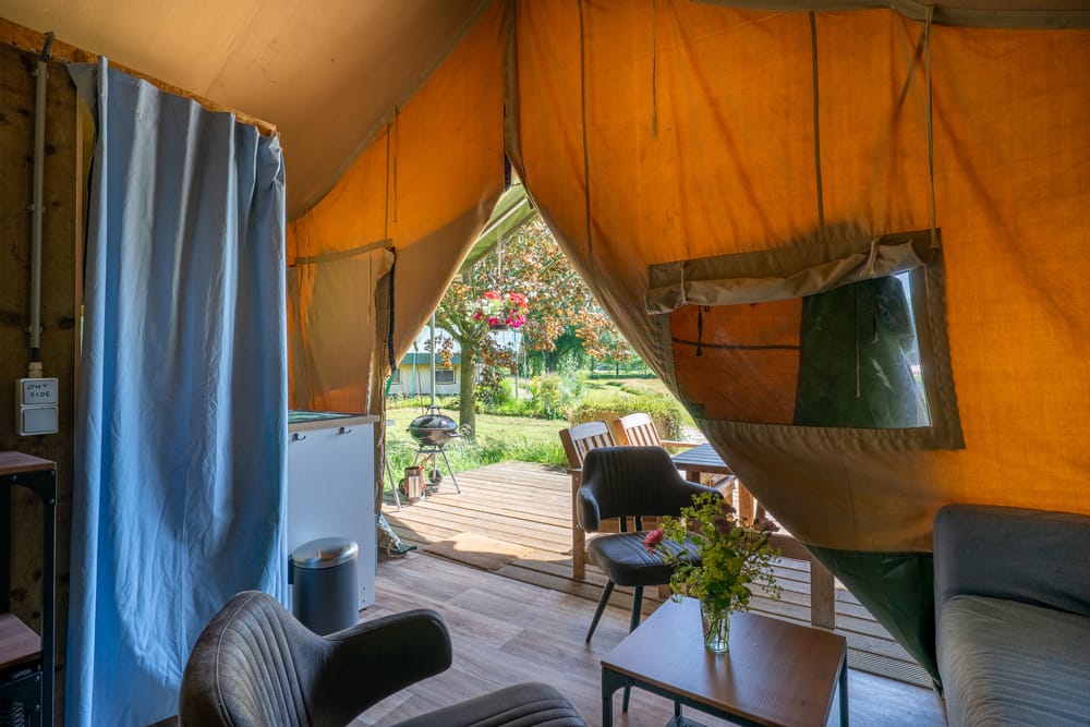 • Polder Pause is onze meest zonnige tent en ligt het dichtstbij onze achteruitgang naar het zwemmeer. Ook is deze tent geschikt voor minder validen, door het looppad.