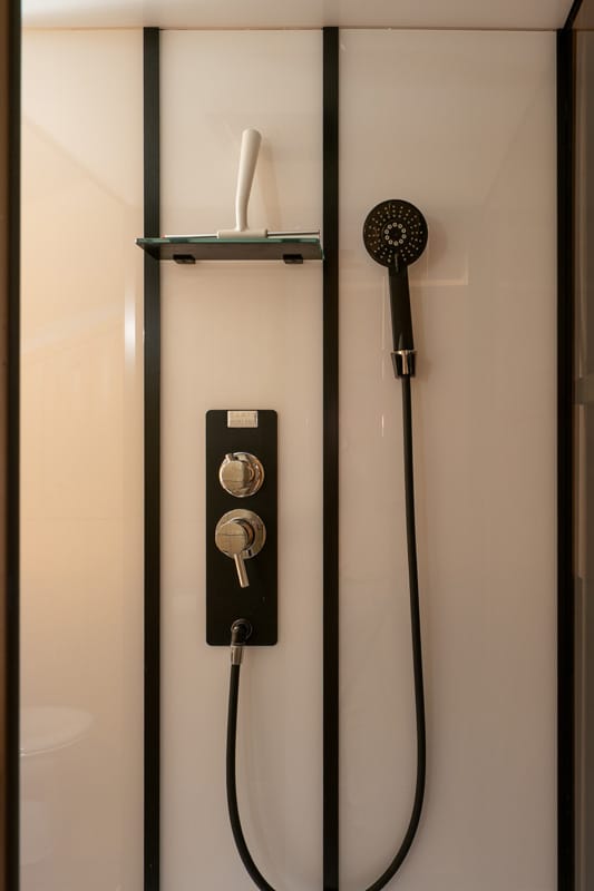 • Badkamer met een stortdouche, wasbak, toilet en föhn